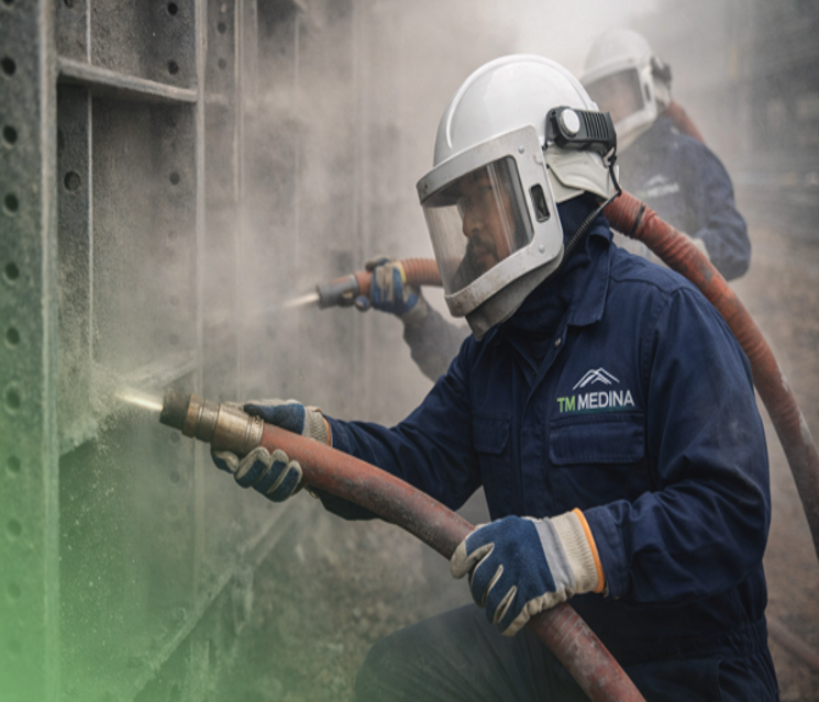 Aplicamos chorro abrasivo a presión para la limpieza profunda de superficies.